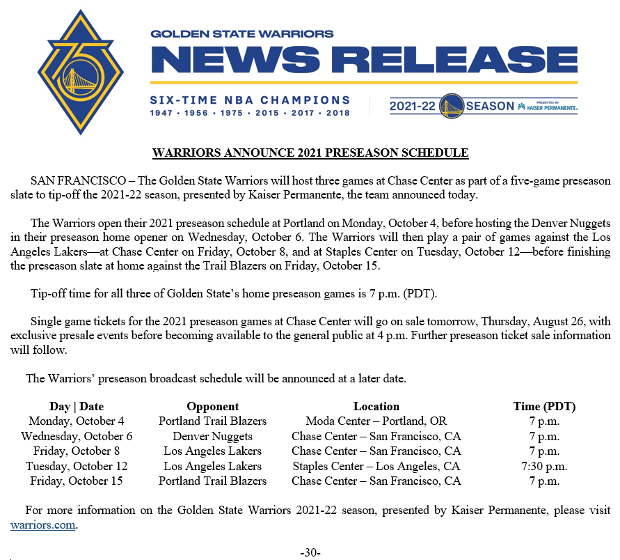Warriors Reveal 2021 Nba Preseason Schedule Open Vs Blazers Nbc Sports Bay Area